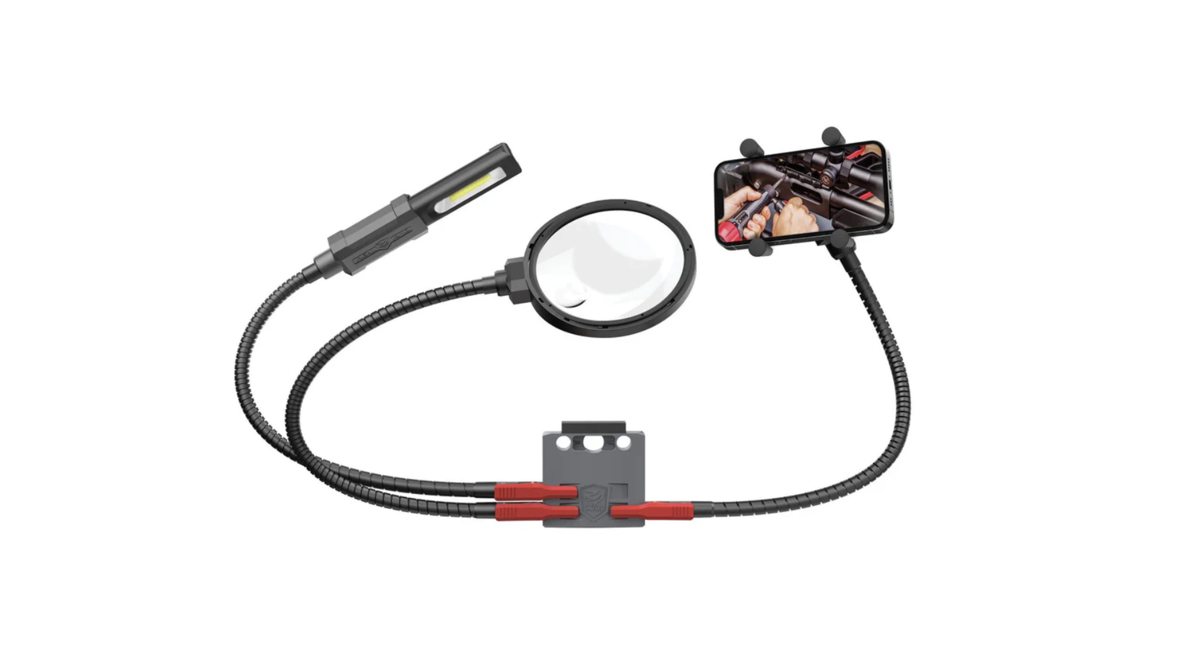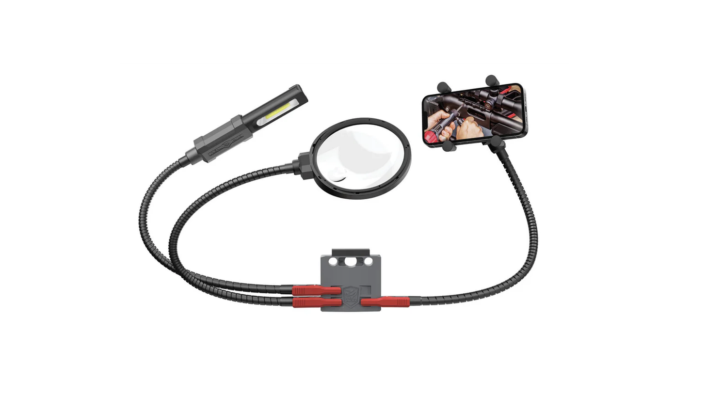 You can see several the Real Avid work station tools in the video but the one I thought was the most ingenious is the Smart Assist Quick-Connect System 3-Pack with Smart Dock. You can mount this cool tool on your workbench or on the Real Avid Master Gun Workstation. Real Avid also offers individual pedestal mounts for the light, magnifying glass or phone holder. It should be obvious how you would use the light and magnifying glass, and the phone holder allows you to video your work or watch an installation video while you’re working. I liked this system so much I ordered another for the workbench in my office. If you have a gun or workbench I’d seriously suggest you give this system a look.