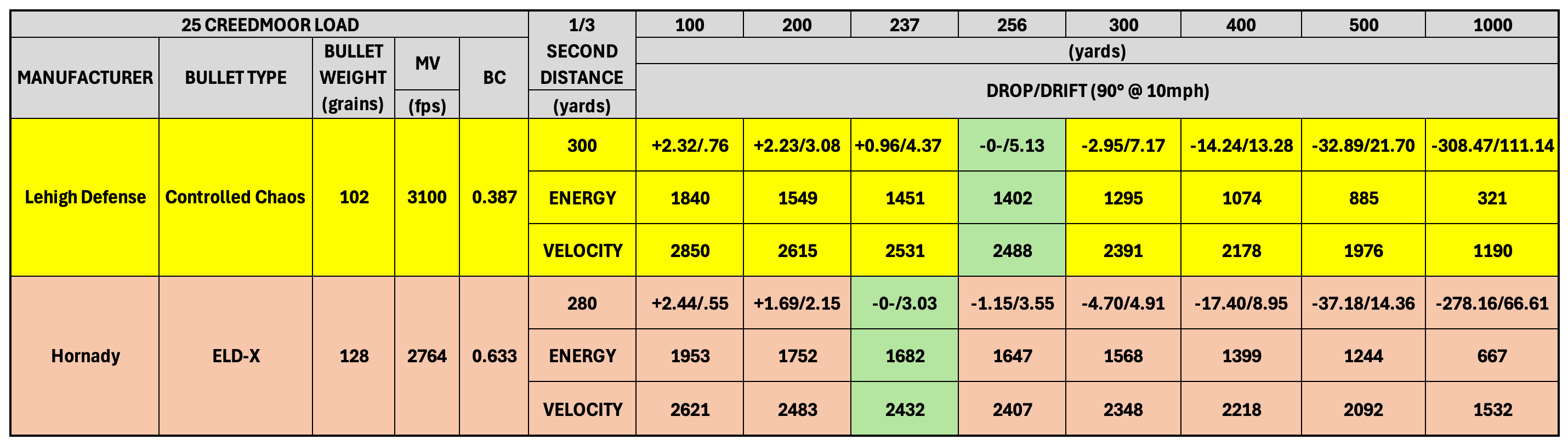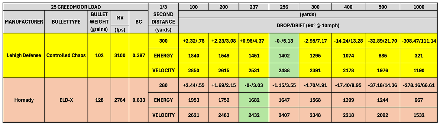 The 1/3 second rule tells you the theoretical distance at which you can hold dead on a six-inch target and not miss. You simply determine how far your bullet can travel in 1/3 of a second and then zero your rifle so the bullet impacts the target three-inches low at that distance. From the muzzle to that distance the bullet remains within three inches of your line of sight. To establish the data for this chart, a 1/3-second zero distance was used for each load. The 102 Controlled Chaos load has a 1/3-second distance of 300 yards, which would put the bullet’s path dead on at 256 yards. The ELD-X load has a 1/3-second distance of 280 yards, which puts the bullet’s path dead on at 237 yards.